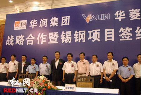 紅網(wǎng)長沙8月9日訊( 記者 劉怡斌 實習生 戴微佳 鄧威美 )今天中午,湖南華菱鋼鐵集團與華潤集團有限公司在長沙舉行戰(zhàn)略合作暨錫鋼項目簽約儀式。華菱集團將增資6.5億元持有錫鋼集團55%的股權(quán),華潤集團繼續(xù)保留其在錫鋼集團45%的股權(quán)。湖南省委書記、省人大常委會主任張春賢等領(lǐng)導見證了這一盛舉。