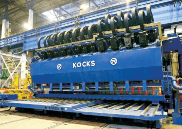 張力減徑機(jī)負(fù)責(zé)無縫管生產(chǎn)中熱管的最后定型。26機(jī)架的SRB包括一系列按順序排放的軋制機(jī)架。這些機(jī)架靠星形傳動(dòng)系統(tǒng)提供動(dòng)力并控制。每個(gè)機(jī)架位置上都設(shè)計(jì)了三根傳動(dòng)軸,且每個(gè)位置都配備了不可調(diào)和可調(diào)機(jī)架。通常,最后一個(gè)不可調(diào)機(jī)架的正后方會(huì)有3個(gè)可調(diào)機(jī)架。對(duì)于這26個(gè)機(jī)架位置,前面23個(gè)機(jī)架位置會(huì)設(shè)計(jì)成不可調(diào)機(jī)架。如果一個(gè)一個(gè)移動(dòng)這些機(jī)架,可能會(huì)造成尺寸不連續(xù)。這些不可調(diào)機(jī)架的正后方是3個(gè)可調(diào)機(jī)架,其作用是用遞增的方式確定鋼管的最終直徑。